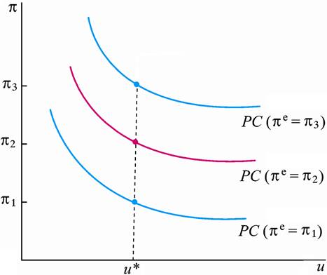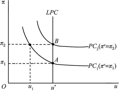 【解析】短期菲利普斯曲线是预期通货膨胀率保持不变时,表示通货膨胀率与失业率之间关系的曲线。附加预期的菲利普斯曲线用方程表示为π=πe-ε(u-u*),πe表示预期通货膨胀率,如图2所示。