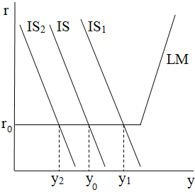 【解析】政府采取不同的财政政策,表现在IS曲线的移动上,具体为扩张性财政政策引起IS曲线向右上方移动,紧缩性财政政策引起IS曲线向左下方移动;政府采取不同的货币政策,则表现在LM曲线的移动上,具体为增加货币的扩张性政策引起LM曲线向右下方移动,减少货币的紧缩性政策引起LM曲线向左上方移动。如果LM曲线水平,政府实行财政政策引起的IS曲线向右上方或左下方移动虽然不会改变利率水平r,但仍然会增加或减少国民收入y。如图1所示,LM曲线水平,政府实行扩张性财政政策,IS曲线向右上方移动到IS1时,收入由y0相应增加到y1;政府实行紧缩性财政政策,IS曲线向左下方移动到IS2时,收入由y0相应减少到y2,这表明财政政策起到效果。