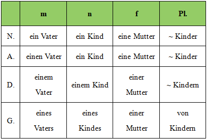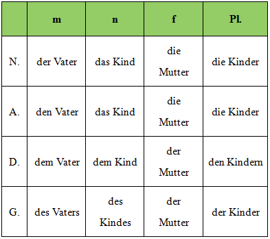 4个格:第1格(Nominativ, N)、第2格(Genitiv, G)、第3格(Dativ, D)、第4格(Akkusativ, A)。