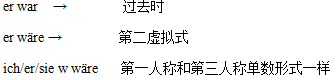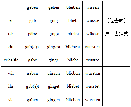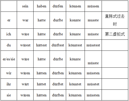 *在第二虚拟式中元音要变音:a→ä,o→ö,u→ü