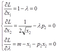 解得:x1=m-1/(4p2),x2=1/(4p22)。此即为消费者的需求函数,此时m>1/(4p2)。