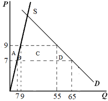 征收关税前后,生产者剩余增加A,即(1/2)×(9-7)×(7+9)=16,政府的关税收入为C,即(55-9)×2=92。由(3)可知,消费者剩余减少(A+B+C+D),即为120,因此社会福利的无谓损失为(B+D),即为120-92-16=12。