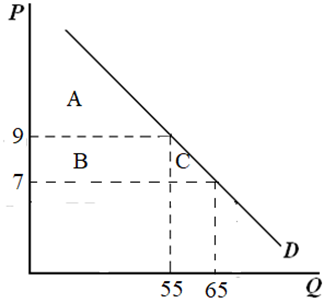 (3)当征收关税时,消费者需求量Q=100-5P=100-5×9=55。如图1所示,征收关税后,消费者剩余减少B+C,即减少(1/2)×(9-7)×(55+65)=120,政府的关税收入为B的面积,即为2×55=110,社会福利的无谓损失为C的面积,即为(1/2)×(9-7)×(65-55)=10。