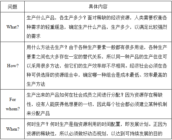 上述四个问题被称为资源配置问题,不同的社会经济制度解决这四个基本经济问题的方式是不同的。