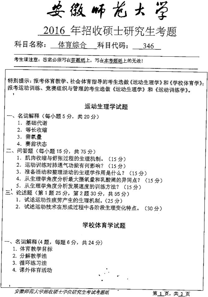 2016年安徽师范大学346体育综合[专业硕士]考研真题