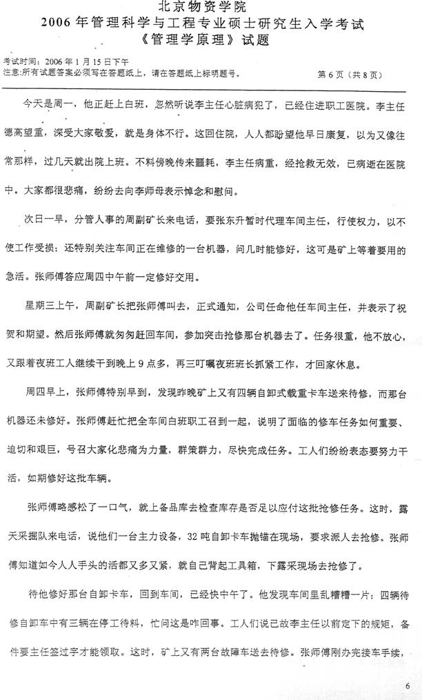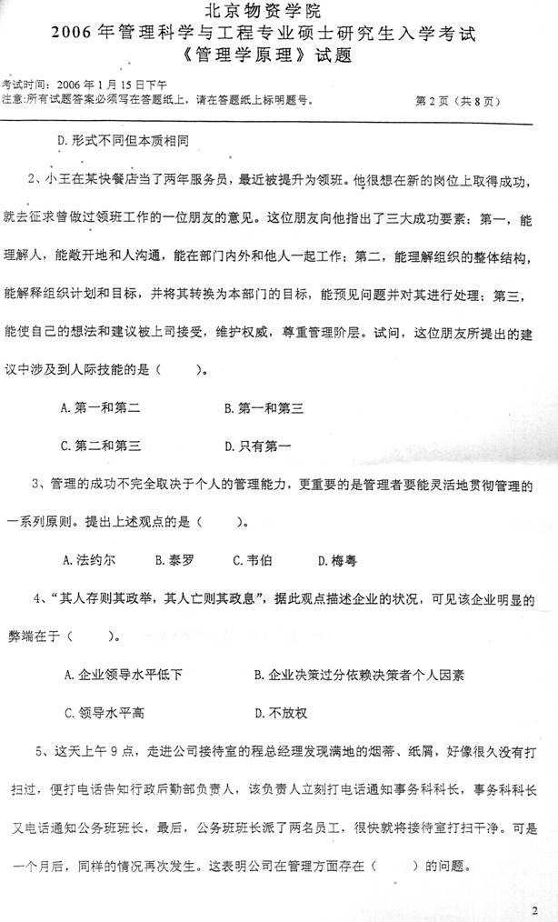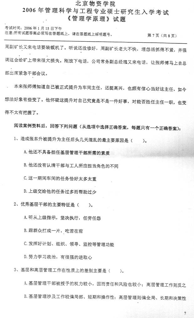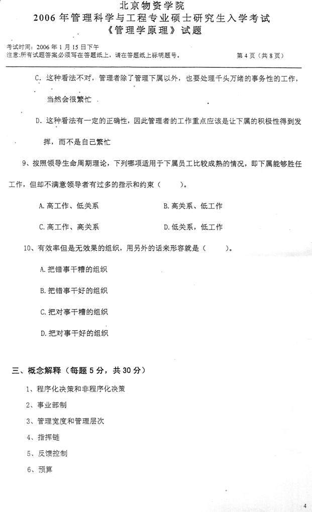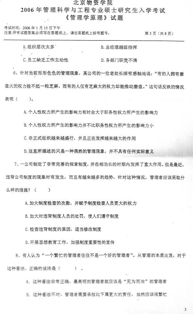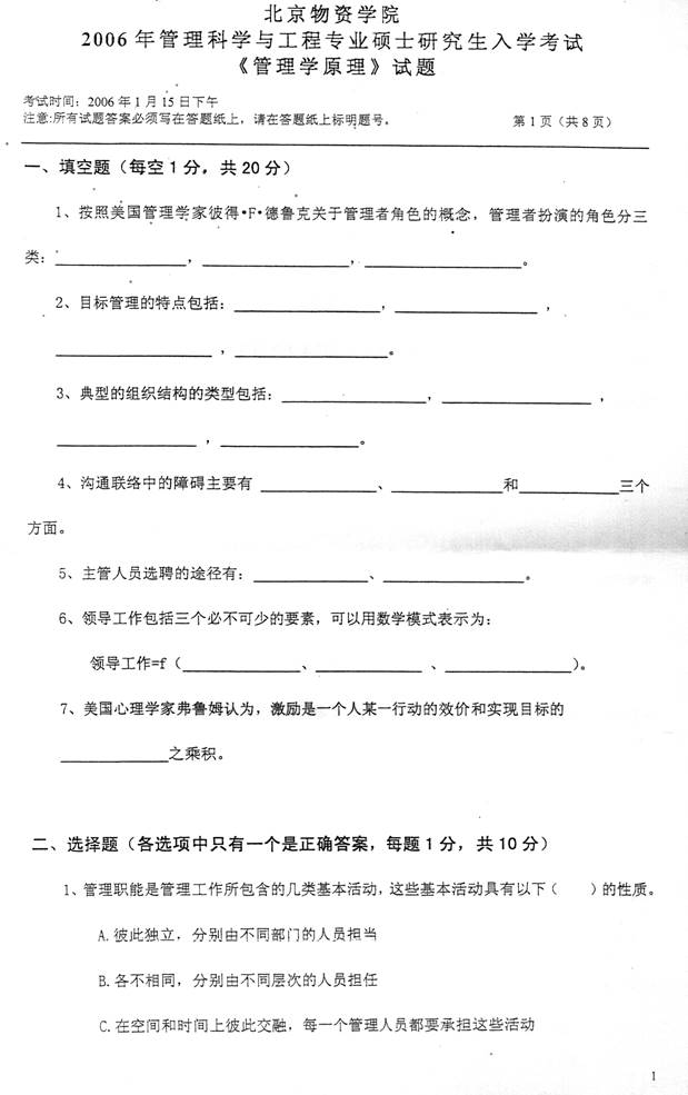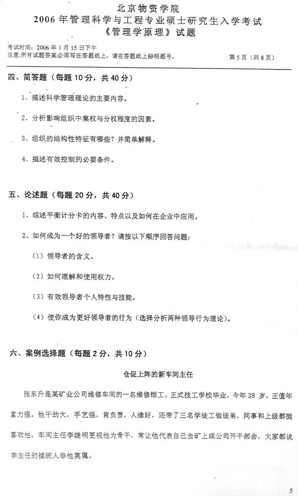 1. 北京物资学院《811管理学原理》历年考研真题汇总