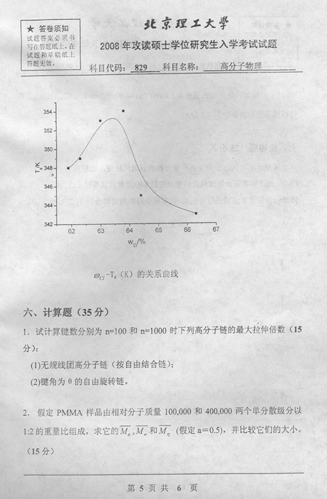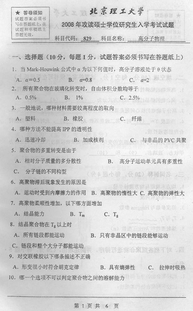 2008年北京理工大学829高分子物理考研真题