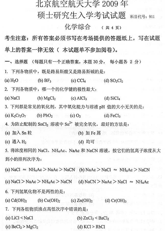 1. 北京航空航天大学化学学院《912化学综合》历年考研真题汇总