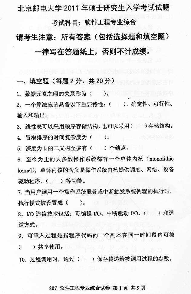 2011年北京邮电大学《807软件工程专业综合》考研真题