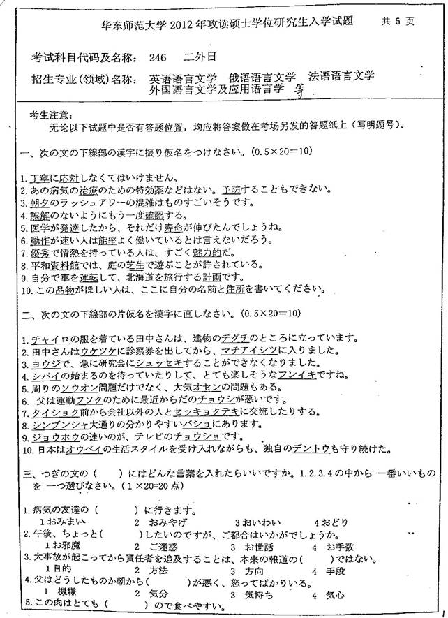 2007年华东师范大学外语学院246二外日语考研真题及详解