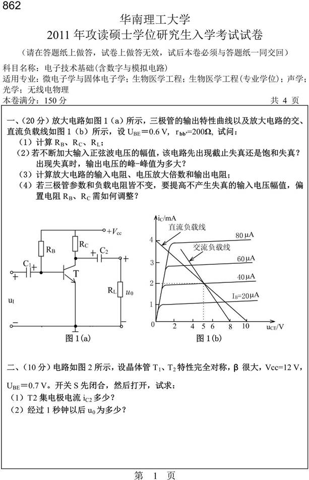 2011年华南理工大学862电子技术基础(含数字与模拟电路)考研真题