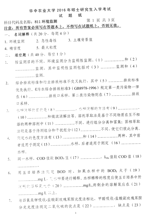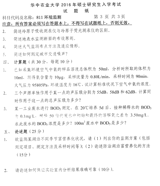 1. 华中农业大学资源环境学院《811环境监测》历年考研真题汇总