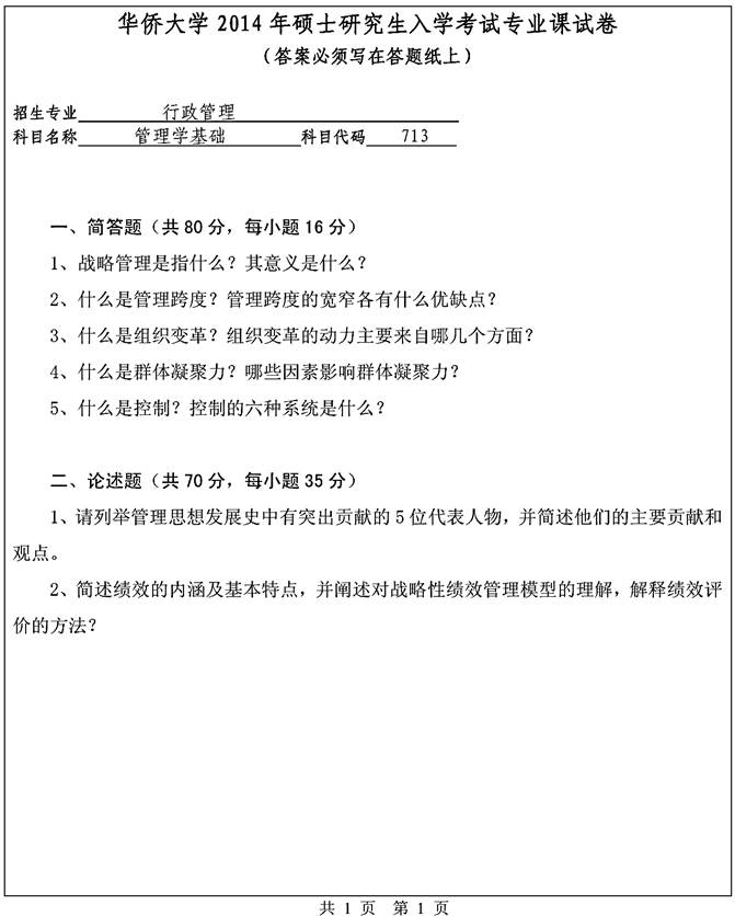 1. [电子书]华侨大学政治与公共管理学院《管理学基础》历年考研真题汇总(含部分答案)