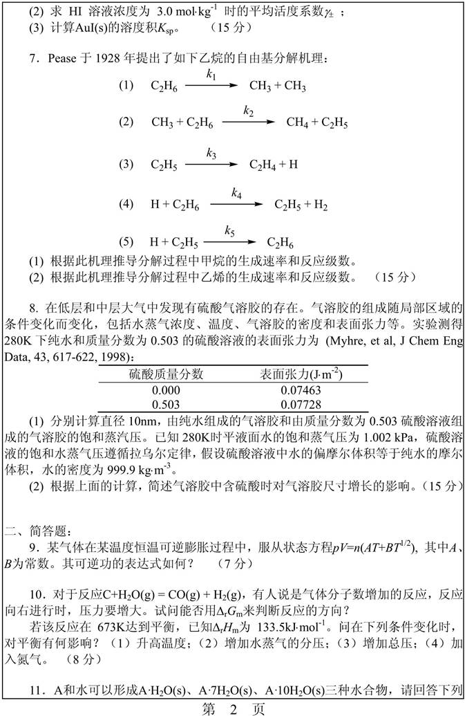2. 全国名校物理化学考研真题汇总(含部分答案)