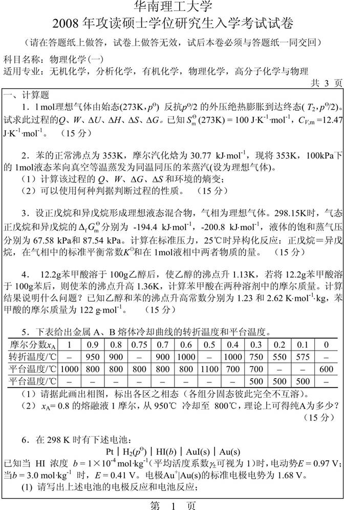2008年华南理工大学629物理化学(一)考研真题