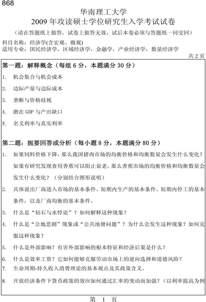 2009年华南理工大学《868经济学(含宏观、微观)》考研真题