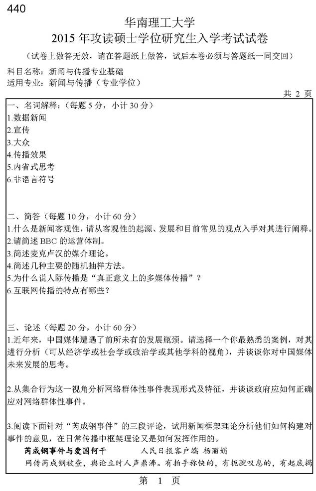 2015年华南理工大学《440新闻与传播专业基础》考研真题