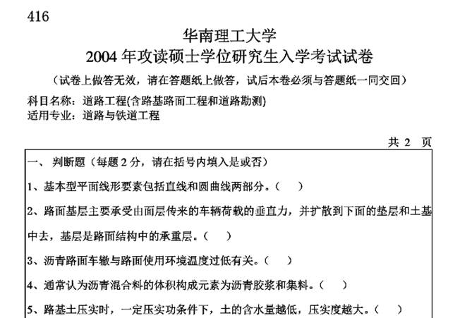 2004年华南理工大学《416道路工程(含路基路面工程和道路勘测设计)》考研真题