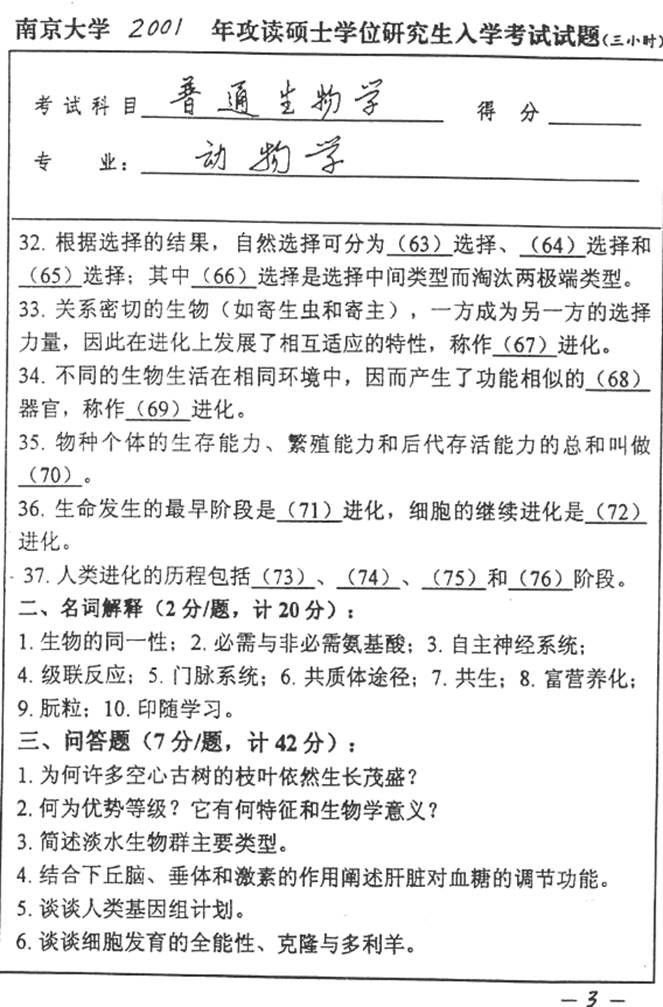 2001年南京大学《普通生物学》考研真题