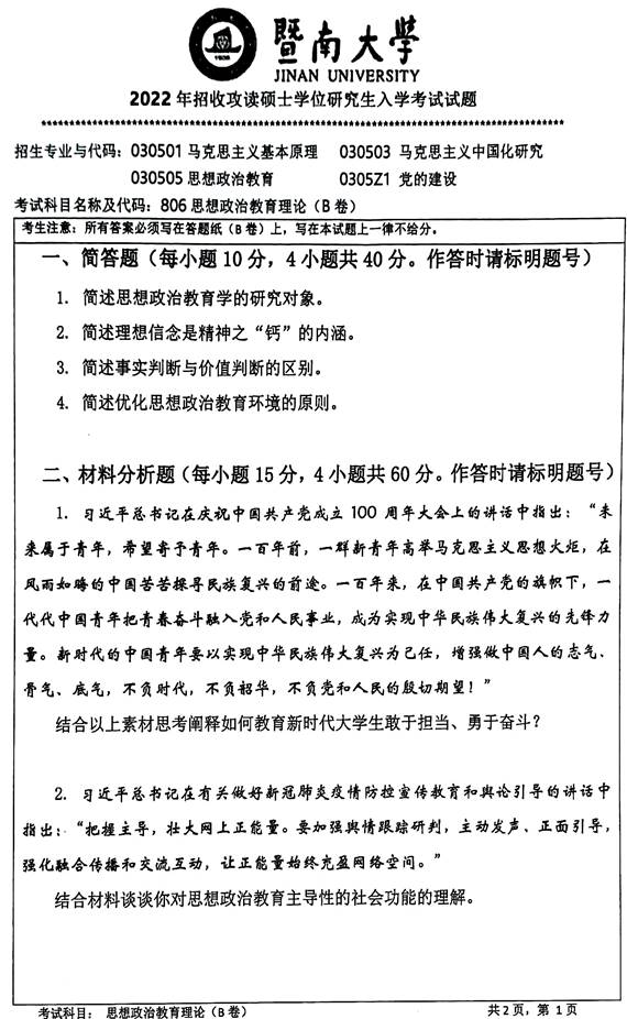 2022年暨南大学827思想政治教育原理考研真题及详解