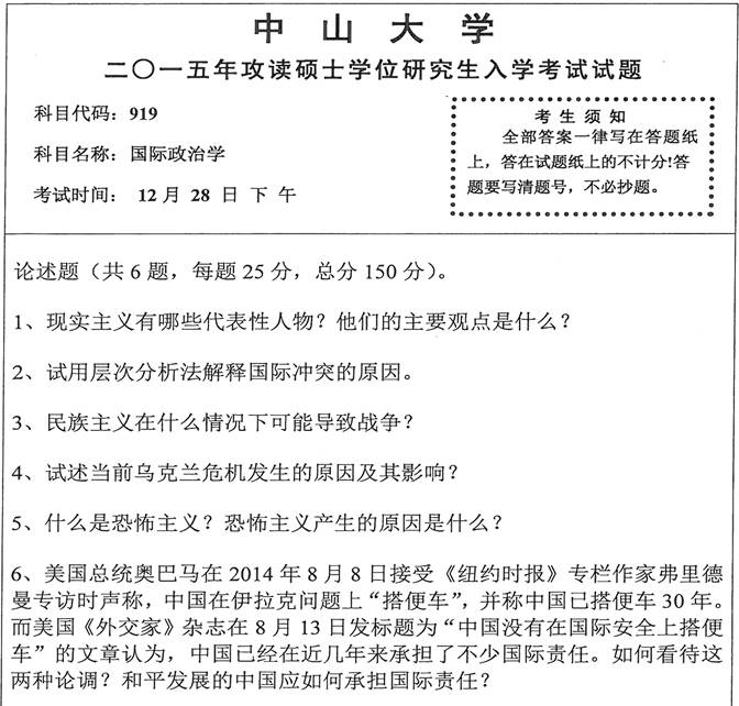 2015年中山大学919国际政治学考研真题及详解