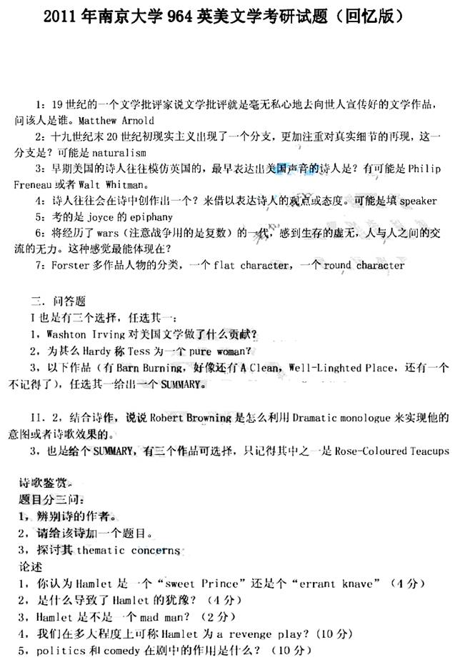 南京大学外国语学院《964英美文学》历年考研真题及详解