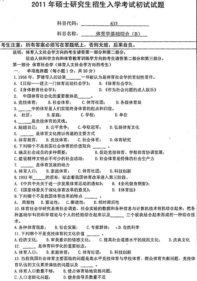 2011年南京师范大学635体育学基础综合考研真题