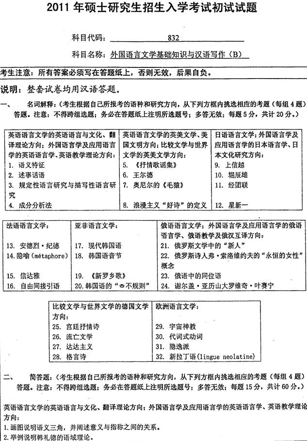 2011年南京师范大学《832外国语言文学基础知识与汉语写作》考研真题