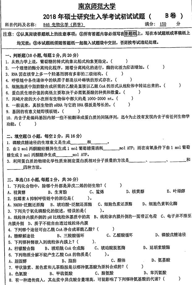 2018年南京师范大学《846生物化学(药学)》考研真题