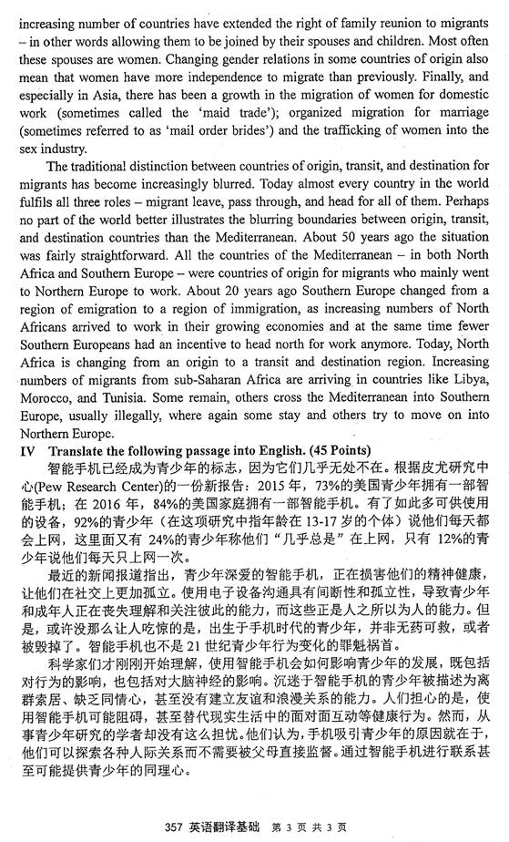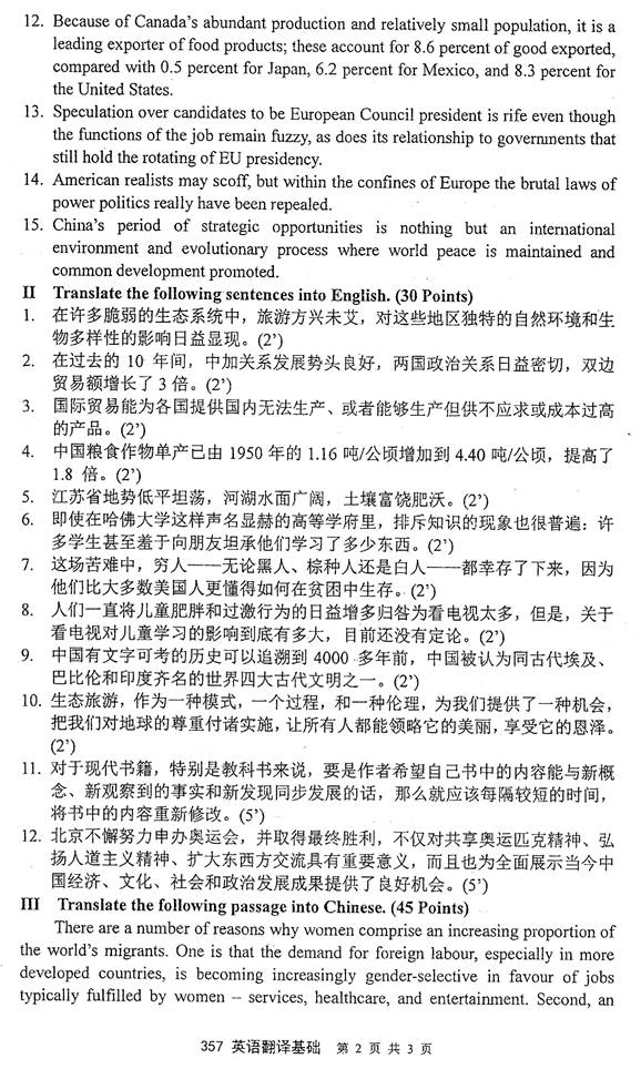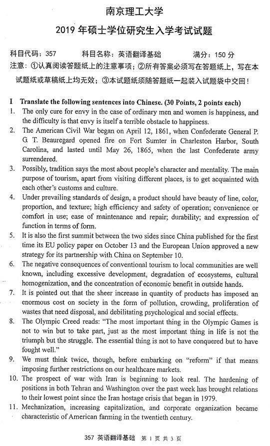 南京理工大学外国语学院《357英语翻译基础》历年考研真题汇总
