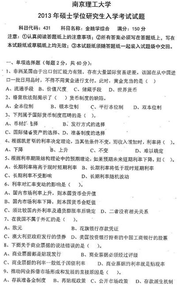 1. 南京理工大学《431金融学综合》[专业硕士]历年考研真题汇总