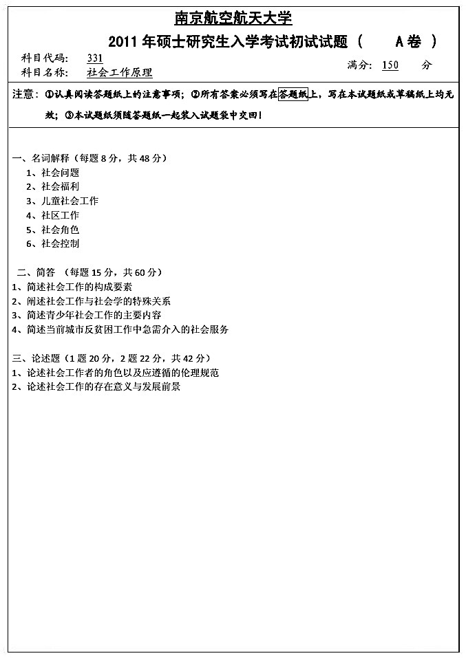 1. 南京航空航天大学人文与社会科学学院《331社会工作原理》历年考研真题汇总(含部分答案)