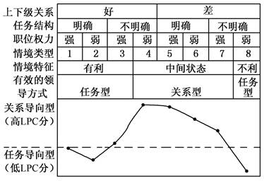 ②提出了领导和领导者是某种既定环境的产物的科学观点。即:S=f(L,F,E)。式中,S代表领导方式,L代表领导者特征,F代表追随者的特征,E代表环境。即领导方式是领导者特征、追随者特征、环境的函数。根据确定领导方式的这几个环境变量,菲德勒提出了影响领导风格最重要的三个因素:上下级关系、职位权利、任务结构。比较其他领导方式理论,菲德勒模型考虑的环境变量更多、更科学,同时考虑了领导者、被领导者和工作等几个方面。细分化的环境变量能够更准确地确定相应的领导方式。