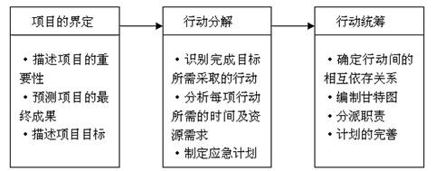 (4)项目计划的各个过程依靠其结果相互联系,一个过程的结果或输出是另一个过程的输入。项目的界定为行动分解提供了依据,行动是根据项目目标来制定的;行动分解又是行动统筹的基础,行动统筹是对分解出来的行动进行统筹。只有前一个环节的工作完成好了,才能展开后一个环节的工作;前一个环节工作完成的准确性,会影响到后面环节的准确性。