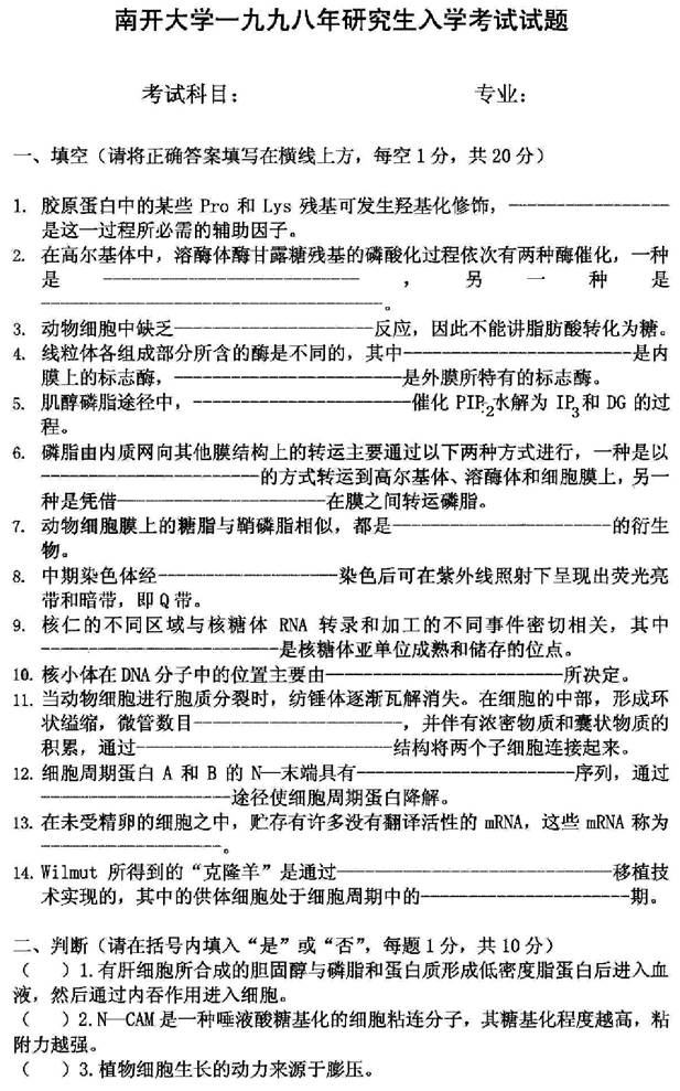 1999年南开大学细胞生物学考研真题(非常不完整)