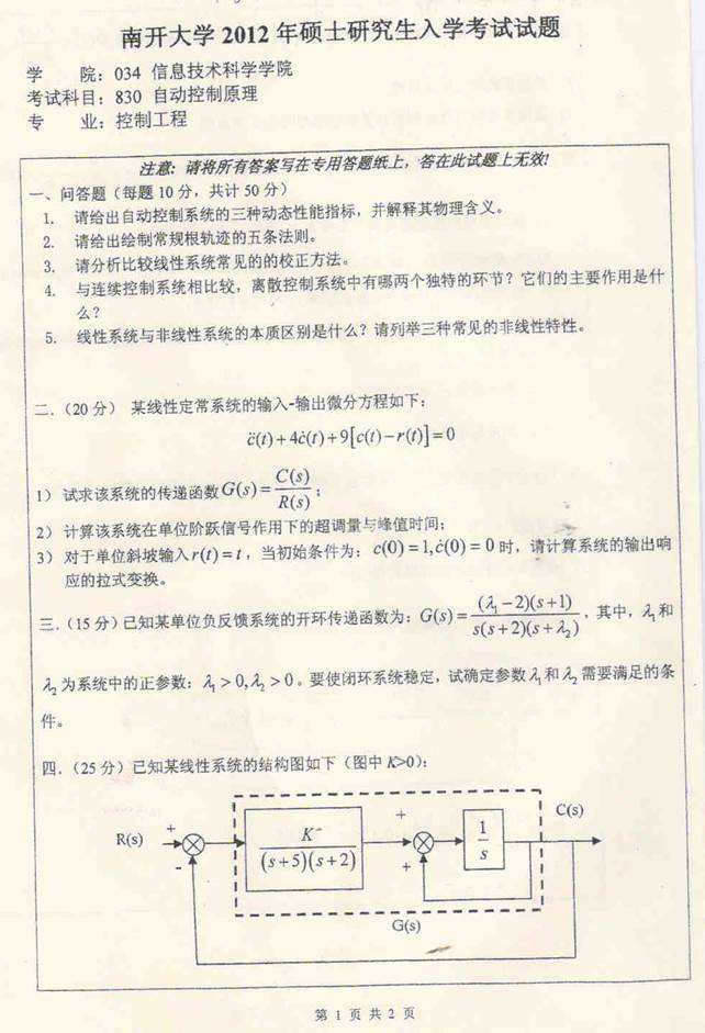 1. 南开大学人工智能学院《自动控制原理》[专业硕士]历年考研真题汇总