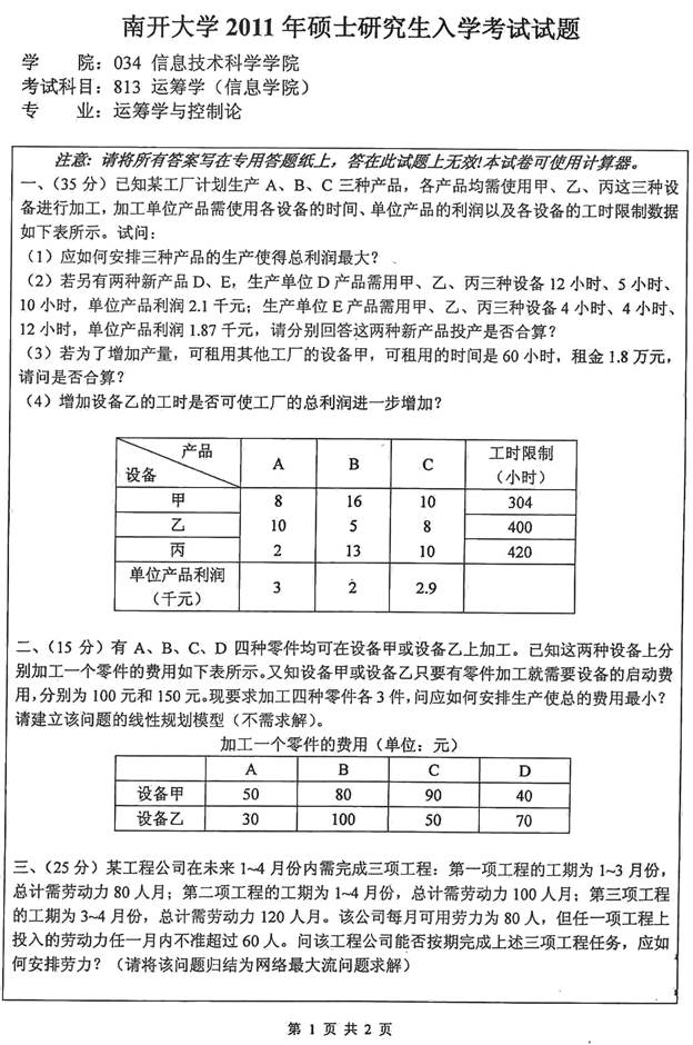 2011年南开大学信息技术科学学院813运筹学考研真题