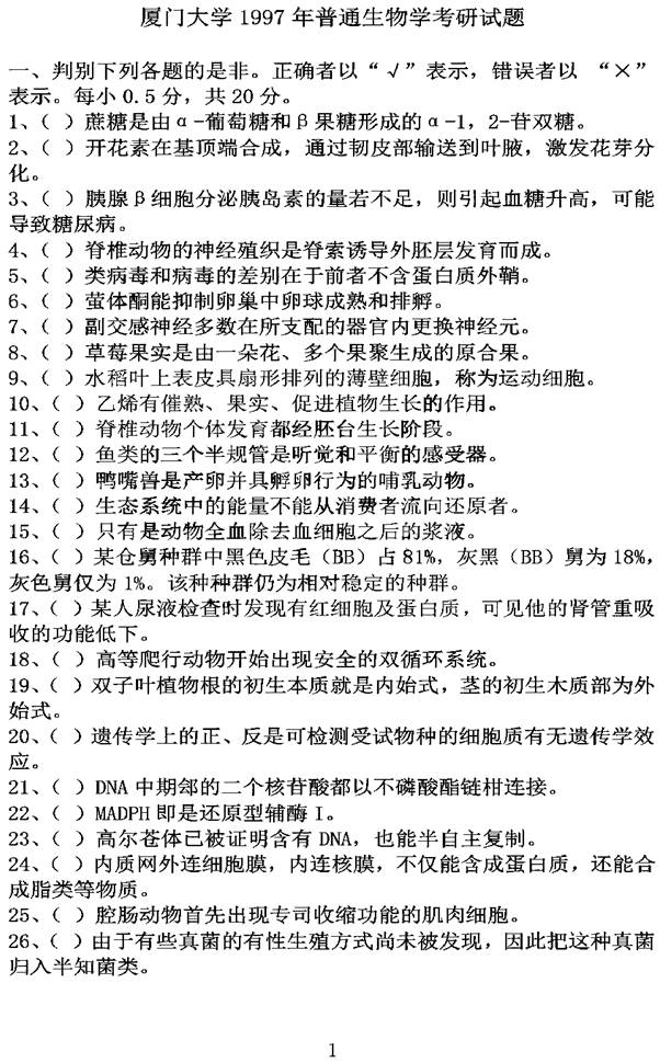 1. 厦门大学海洋与地球学院《840普通生物学》历年考研真题汇总