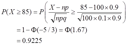 解:由题意可知每个部件正常工作的概率为0.9,总样本数n=100,用X表示正常工作的部件的数量,X~B(100,0.9),则整个系统起作用的概率为P(X≥85)。np=90>5且n(1-p)=9>5,根据棣莫弗-拉普拉斯中心极限定理可知,