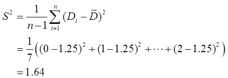 第二步:计算D的均值和方差:D(_)=(0+1+3+2+1+2-1+2)/8=1.25
