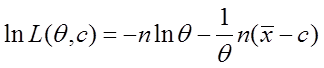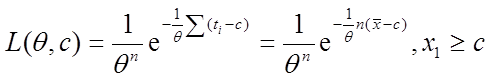 因为lnL(θ,c)关于c单调递增,且当x1>c时L>0,当x1<c时L=0,所以c()L=x1是唯一使L达到最大的c值,即c的MLE。将lnL(θ,c)对θ求偏导并令其等于0,得到-nθ+nx(_)-nc=0,由于似然函数是指数族的形式,且θ()L的属于自然参数空间Θ*={θ:θ≥0}=[0,∞)的内点集,故θ的极大似然估计为θ()Lx(_)-x1