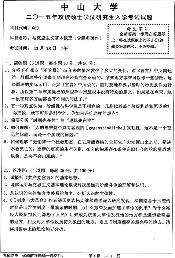 2015年中山大学《660马克思主义基本原理(含经典著作)》考研真题