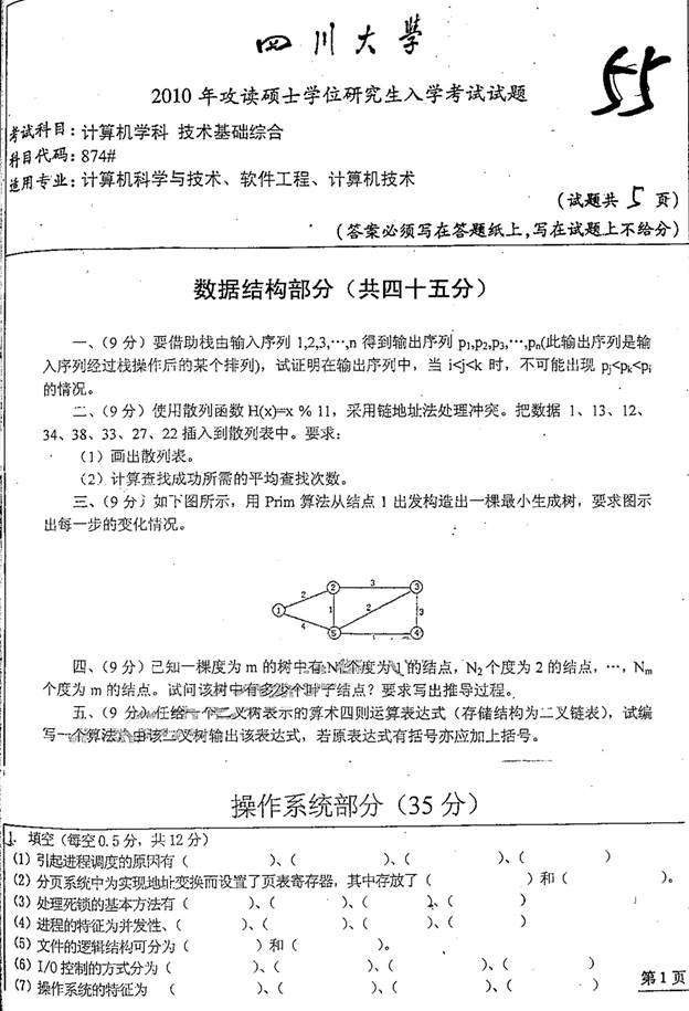 1. 四川大学《874计算机科学专业基础综合》历年考研真题汇总