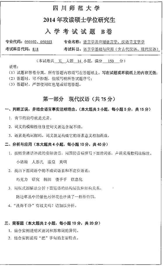2014年四川师范大学《818语言学基础与应用(含古代汉语、现代汉语)》考研真题