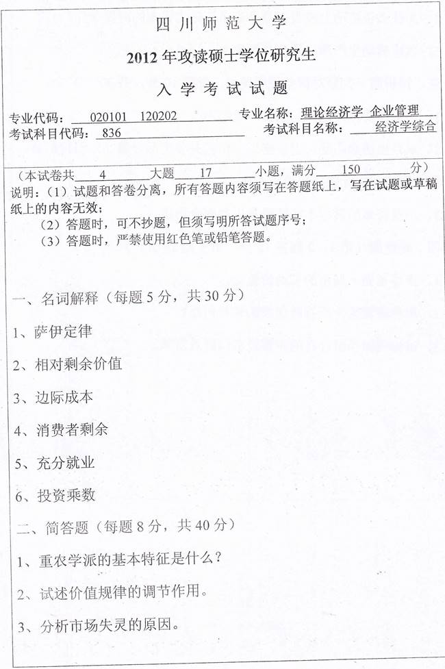 2012年四川师范大学《836经济学综合》考研真题