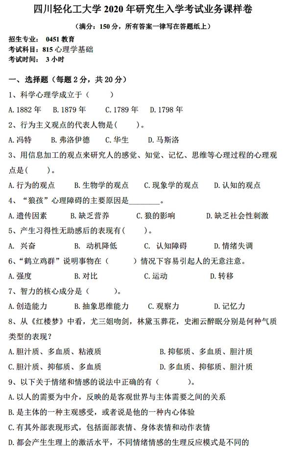 1. 四川轻化工大学《815心理学基础》历年考研真题汇总