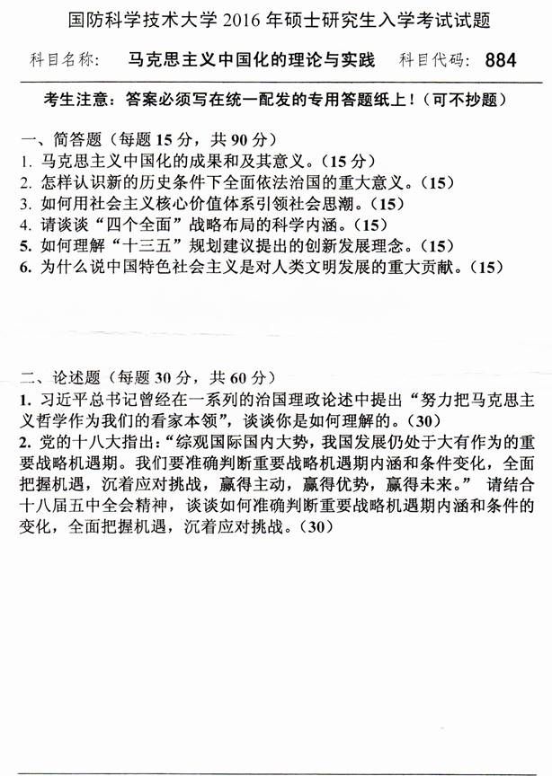 2016年国防科技大学《884马克思主义中国化理论与实践》考研真题