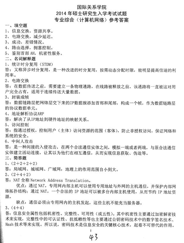 2014年国际关系学院通信与信息系统872专业综合(计算机网络)考研真题及详解