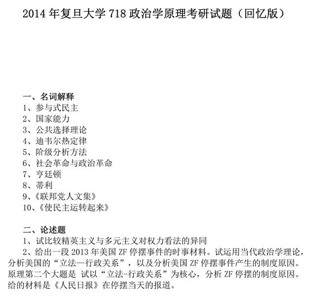 2014年复旦大学718政治学原理考研试题(回忆版)