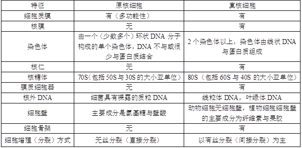 答:真核细胞和原核细胞差异十分明显,主要表现如表1所示: